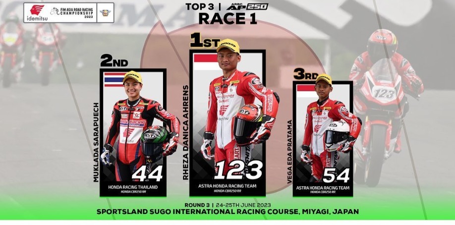 It was a no-shocker in the Asia Production 250cc when Rheza Danica Ahrens of ASTRA HONDA RACING TEAM charged towards the chequered flag ahead of the rest for an impressive win in Race 1 of Round 3, Idemitsu FIM Asia Road Racing Championship that was held at Sportsland Sugo International Racing Course this evening.