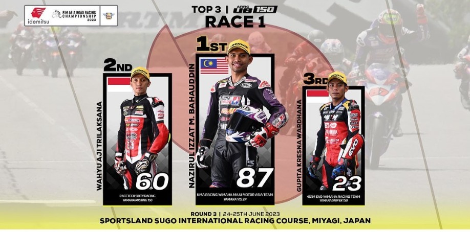 Easily deceivable, the Underbone 150cc race category with a trademark of long trailing riders is one that is not to be missed in the Idemitsu FIM Asia Road Racing Championship. Today, it was a day to celebrate for Nazirul Izzat Bahauddin of UMA Racing YAMAHA Maju Motor Asia Team when he made a grand finish in Race 1 of Round 3 at the Sportsland Sugo International Racing Course.