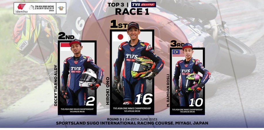Riding aboard the TVS Apache 310 machine, the riders of the TVS Asia One Make Championship put on their best performance to dominate Race 1 of Round 3, Idemitsu FIM Asia Road Racing Championship which was held at the Sportsland Sugo International Racing Course. Standing tall with victory in hand was Hiroki Ono of Japan.