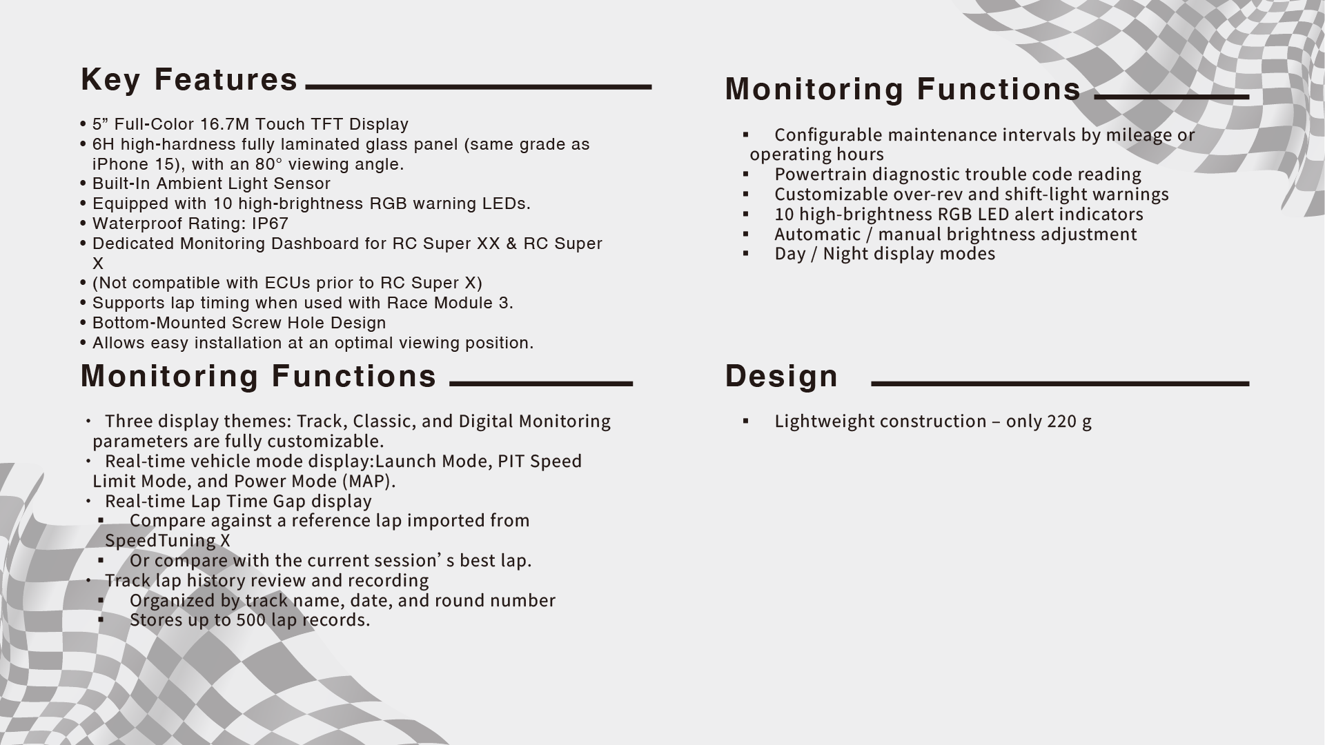Supports lap timing when used with Race Module 3