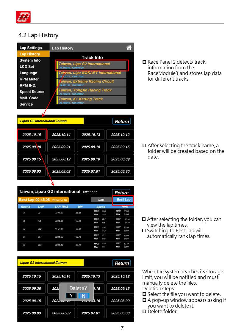 Track lap history recording and review