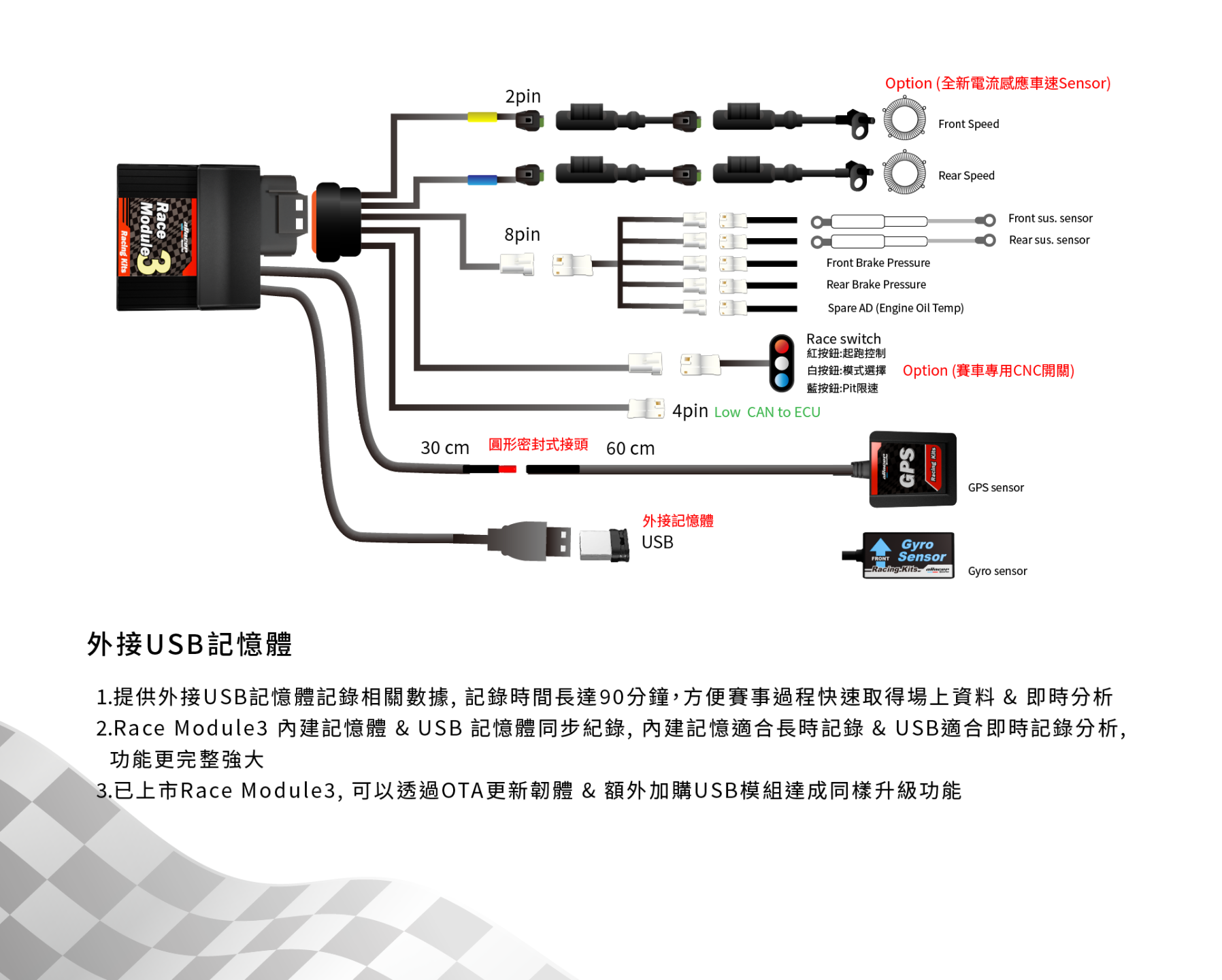 • Race Module3 內建記憶體 & USB 記憶體同步紀錄, 內建記憶適合長時記錄 & USB適合即時記錄分析, 功能更完整強大