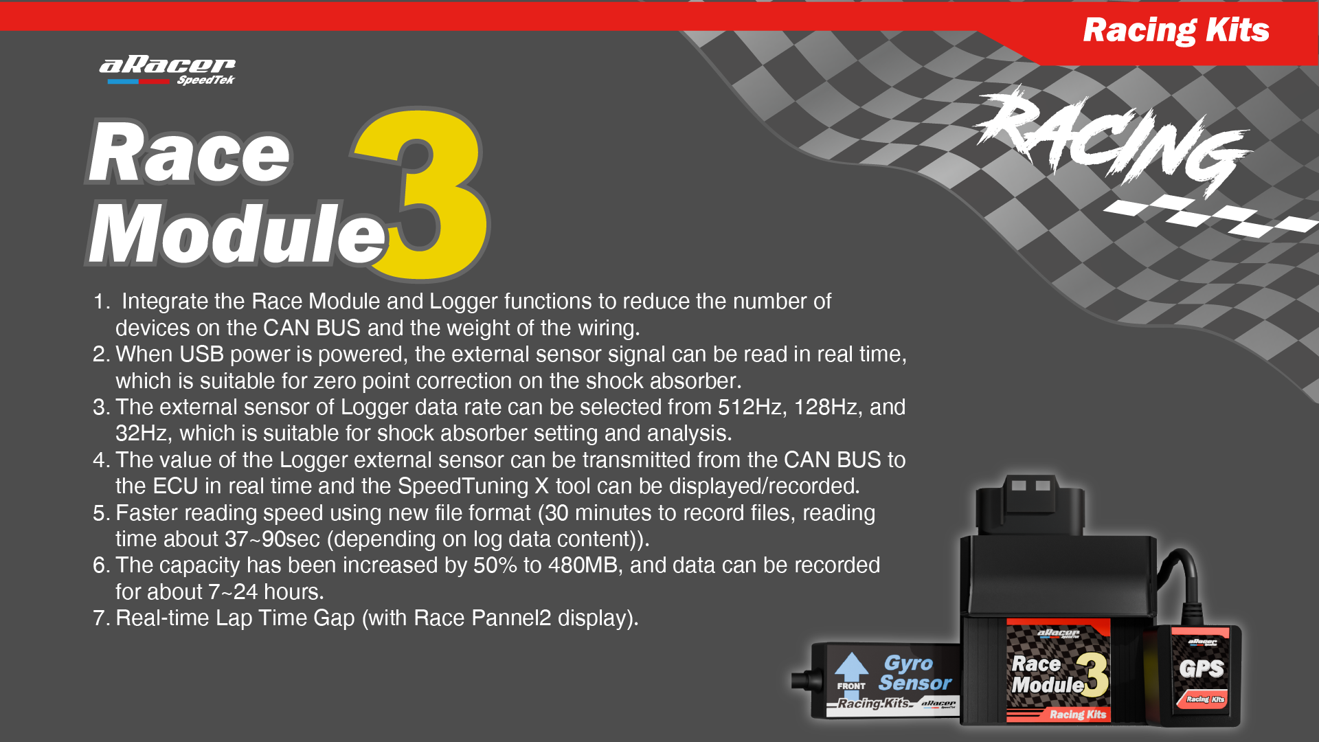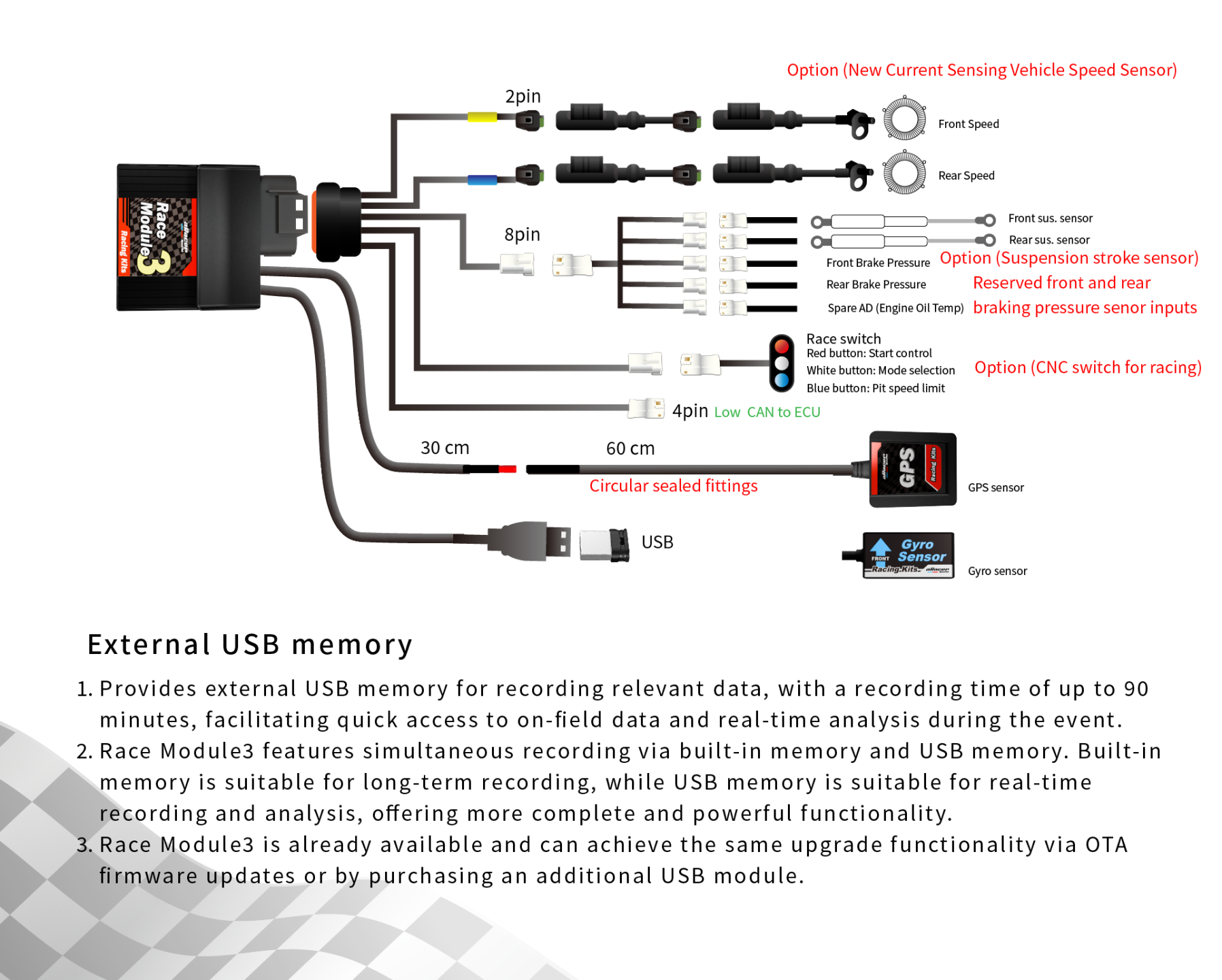 Race Module 3 records simultaneously to built-in memory and USB storage.-