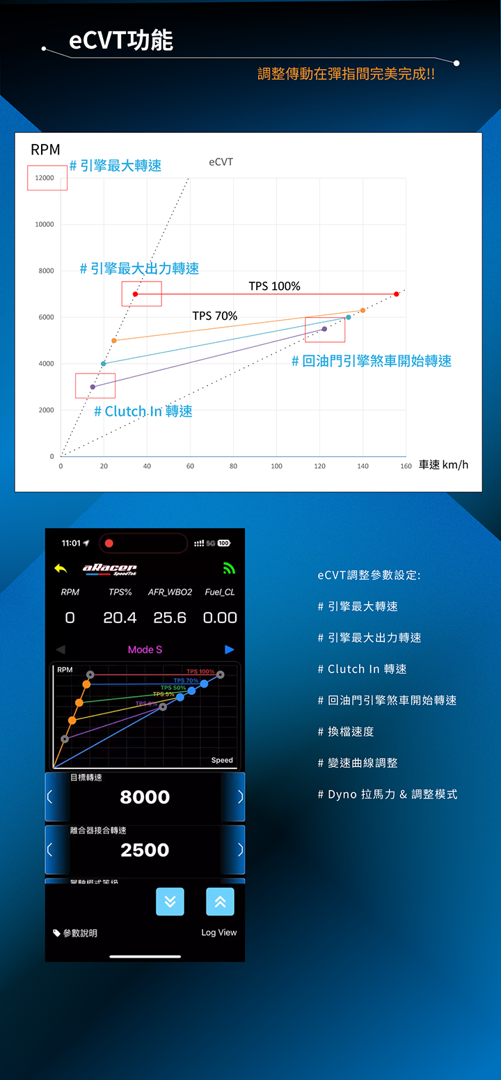 不同模式變速齒比設定接合RPM設定 / 最大馬力變速域RPM設定 /回油引擎煞車RPM設定