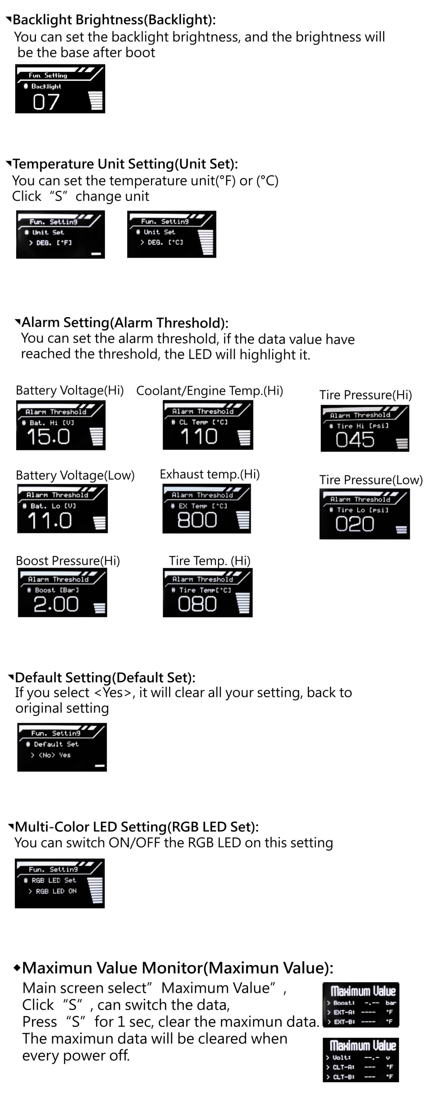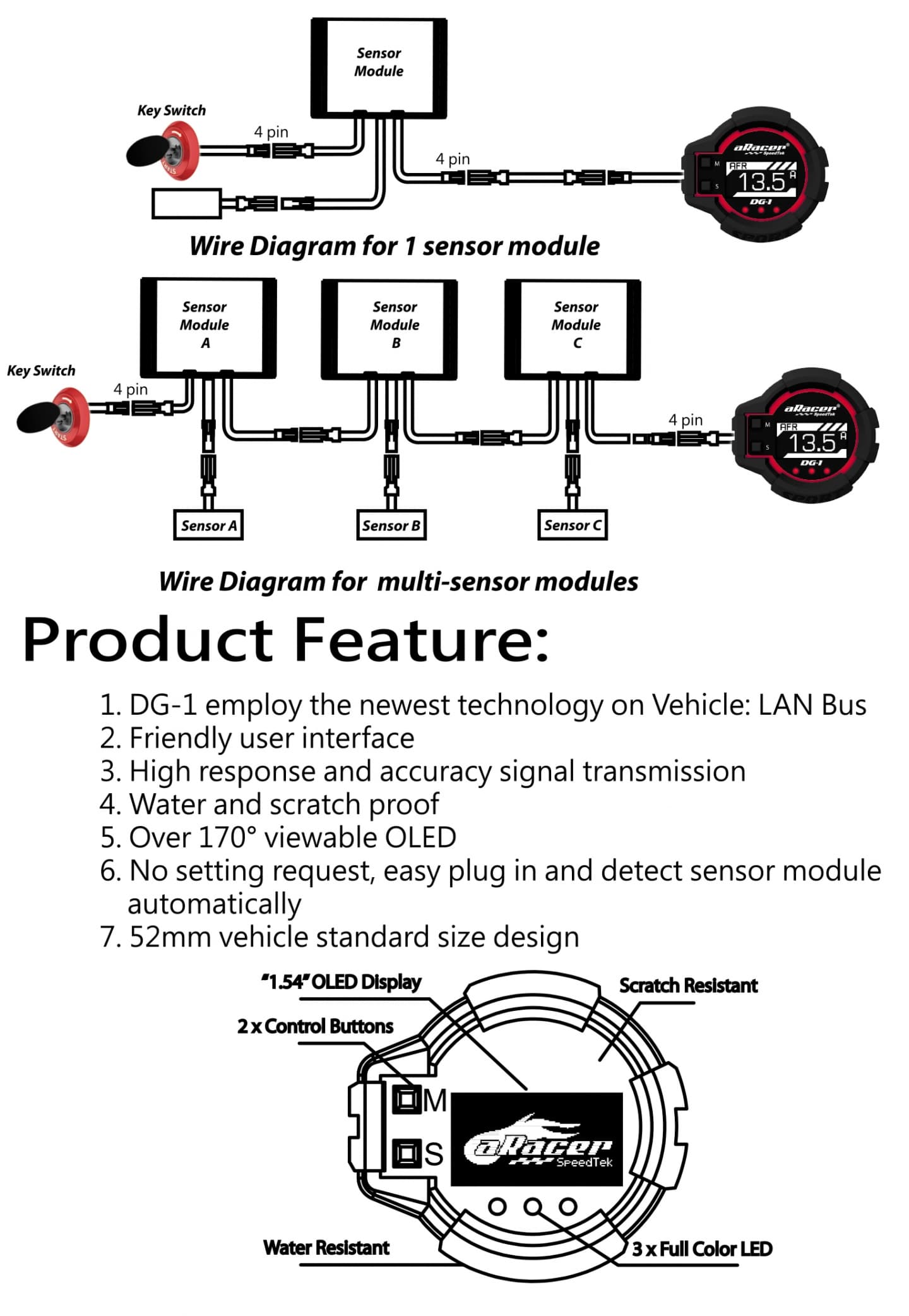 - Extendable sensor modules in the feature: exhaust pipe temp. coolant temp. boot pressure...etc
